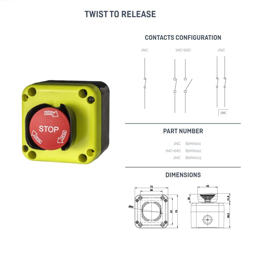 E-STOP modułowa 2NC, okręć aby odblokować, wygrawerowany STOP.